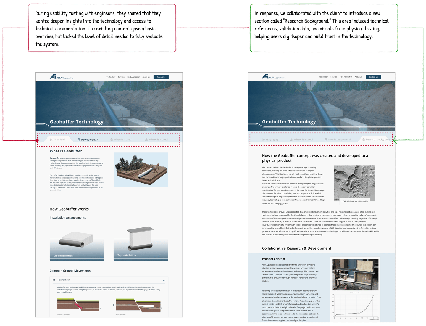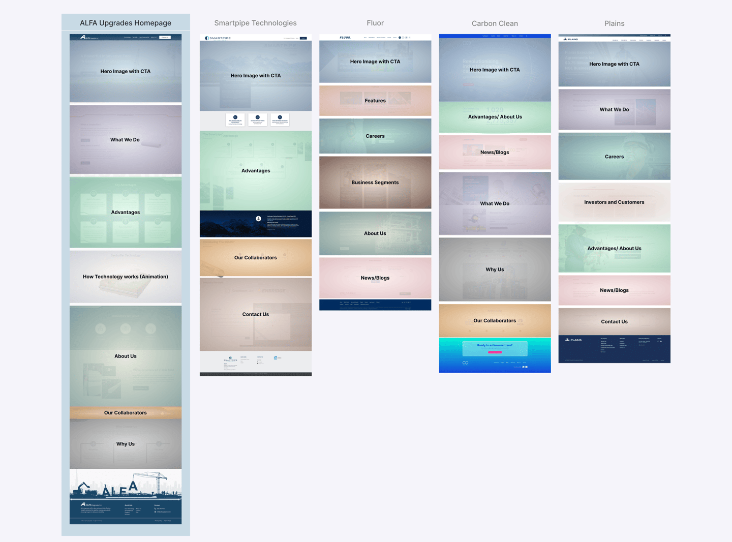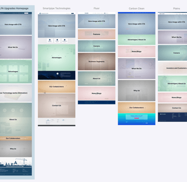 We studied how similar companies organize their websites, focusing on homepage hierarchy and key offerings. This helped us structure ALFA Upgrades’ homepage with familiar content blocks, like “What We Do”, “Technology”, and “Collaborators”, while highlighting the uniqueness of the Geobuffer system.