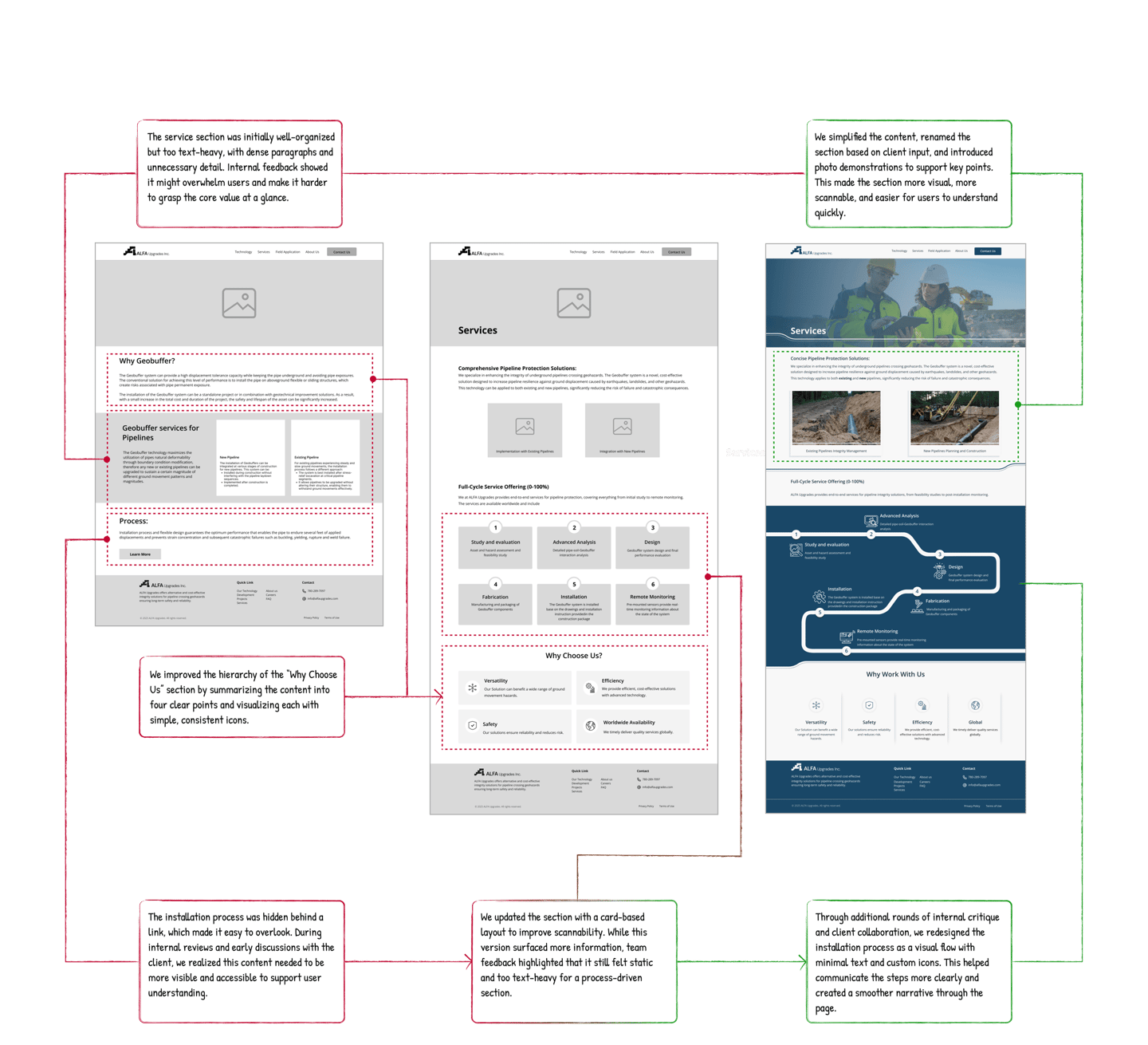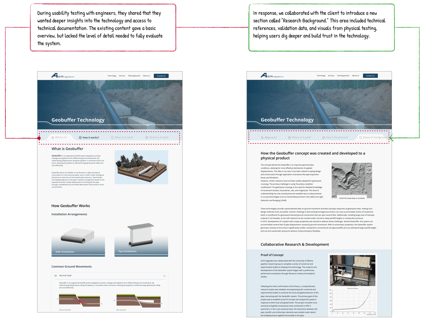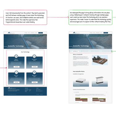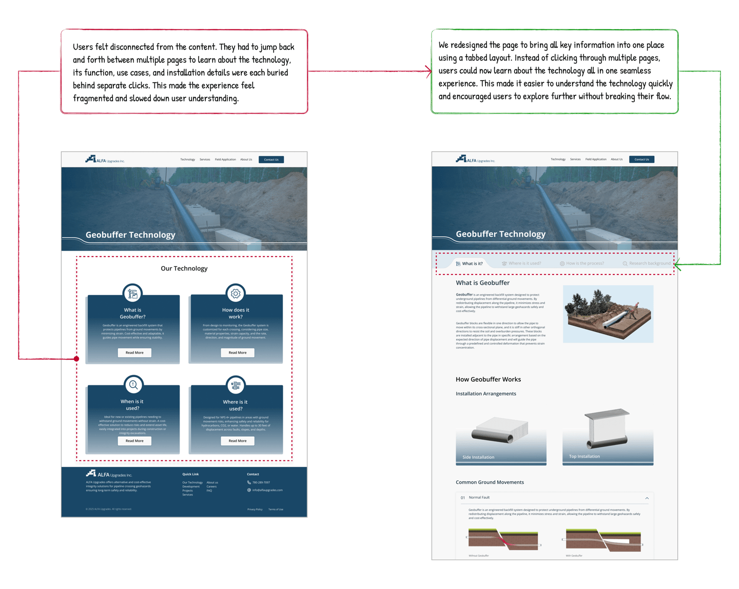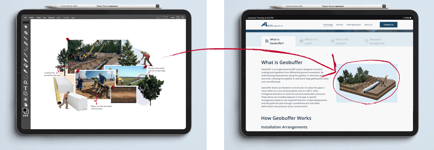 This case study showcases end-to-end responsive design process for the ALFA Upgrades website, a B2B platform introducing an innovative pipeline protection technology called Geobuffer. The project involved transforming complex engineering content into a clear, engaging, and user-friendly digital experience. I collaborated closely with technical experts to craft a narrative that balances technical accuracy with accessible storytelling, while prioritizing visual clarity and usability. The final product helps ALFA Upgrades communicate their mission, technology, and real world impact to industry stakeholders