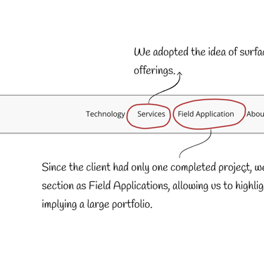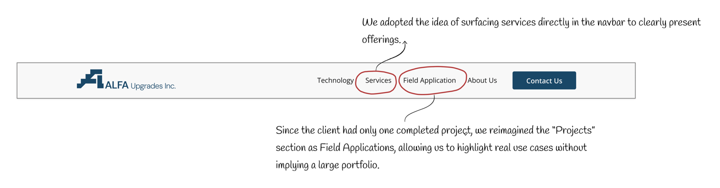 We analyzed navigation, technical content, and visibility of services and case studies. This guided our navbar design, highlighting key pages like 'Technology' and 'Projects' early to build trust and improve findability.