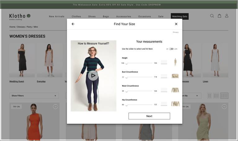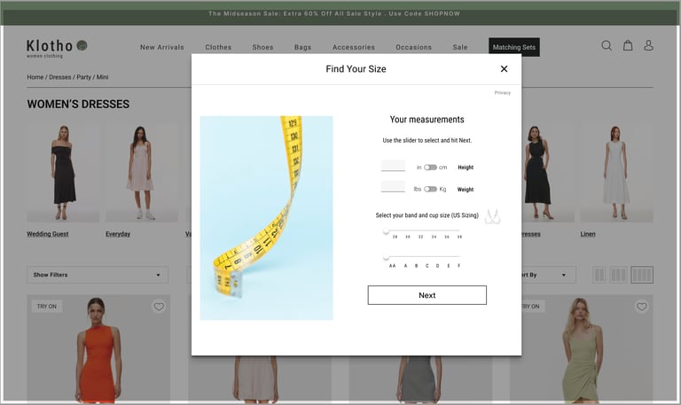 Implemented a Fit Assist feature that asks users a few questions and provides instructions on how to measure their size accurately. This feature then recommends the correct size based on their measurements, helping ensure a better fit and reducing the uncertainty of online shopping.