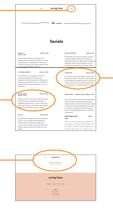 The next step for us was Color Exploration. The Saving Faces stakeholders wanted to maintain the dark blue and peach colors that were already on their Salon and product packaging, but were open to exploring new colors and combinations. Our team explored different color palettes, some included their signature colors and others explored a more natural and earthy tone that was popular among other facial brands.